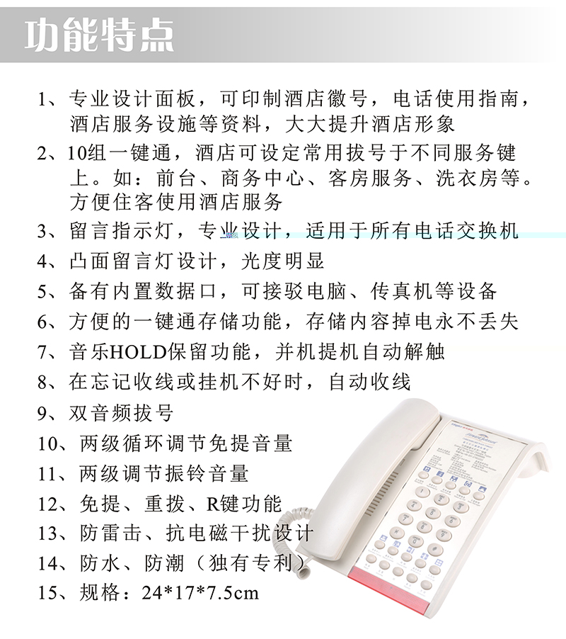 1、专业设计面板,可印制酒店徽号,电话使用指南,酒店服务设施等资料,大大提升酒店形象