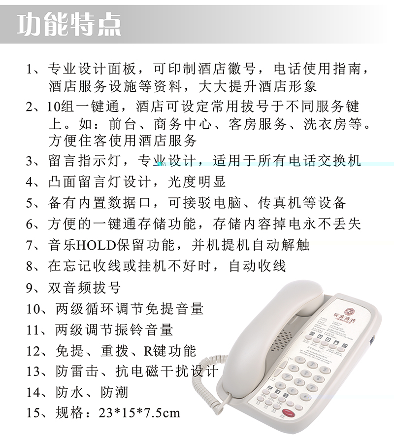 1、专业设计面板,可印制酒店徽号,电话使用指南,酒店服务设施等资料,大大提升酒店形象